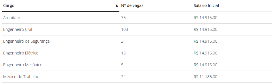 Ao todo, serão 184 vagas distribuídas entre seis cargos. A maior parte é para engenheiros civis, mas também há oportunidades para arquitetos e médicos do trabalho. Os salários variam de R$ 11.186,00 a R$ 14.915,00.