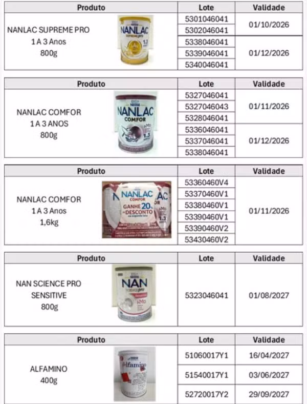 A Agência Nacional de Vigilância Sanitária (Anvisa) proibiu a comercialização, a distribuição e o uso de alguns lotes de fórmulas infantis das marcas Nestogeno, Nan Supreme Pro, Nanlac Supreme Pro, Nanlac Comfor, Nan Sensitive e Alfamino, fabricadas pela Nestlé Brasil.
